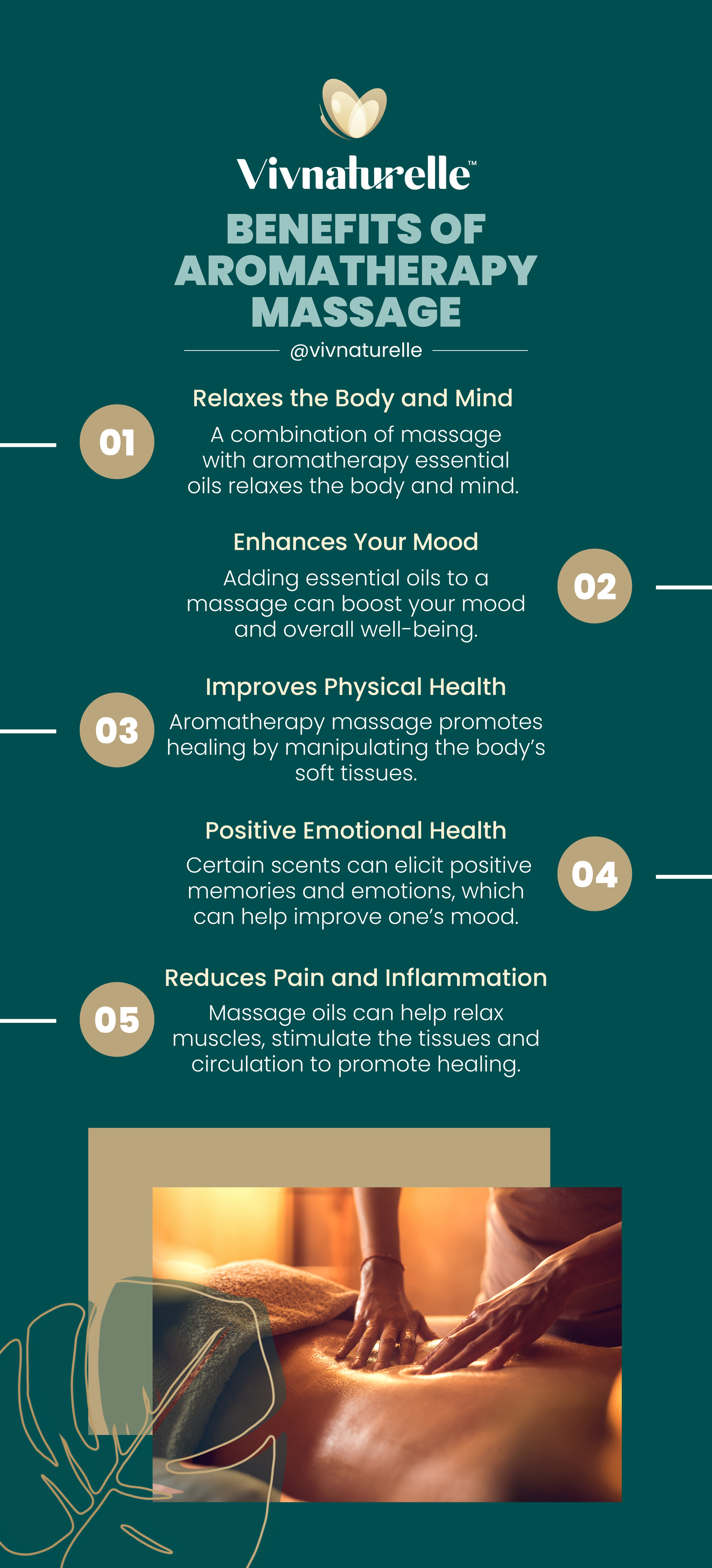 Pain and inflammation relief are some benefits of aromatherapy massage. You can achieve this by applying essential oils topically to the skin after diluting in a carrier oil during a massage session. Massage oils can help relax and soothe muscles, stimulate the tissues and increase circulation to promote healing and get rid of toxins during a therapeutic massage.