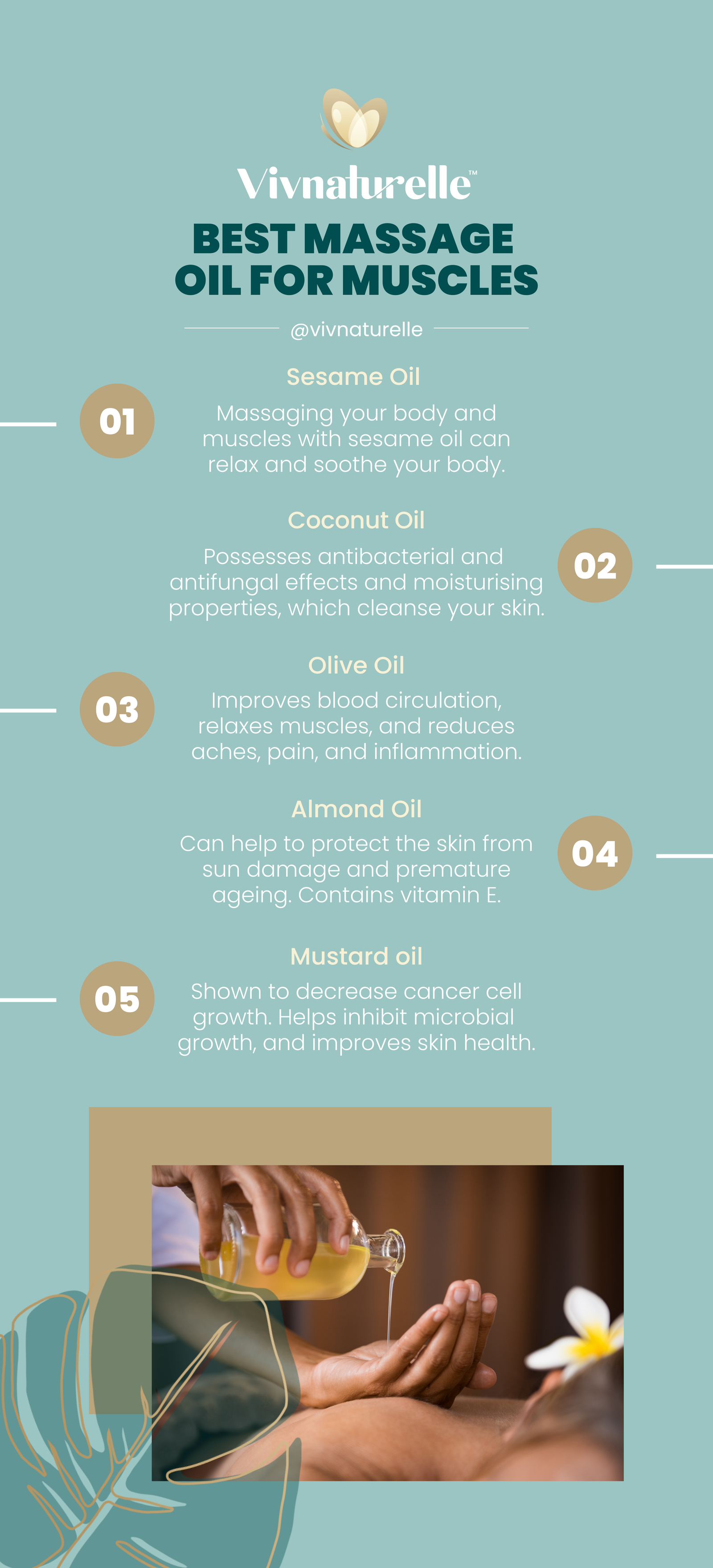 Olive oil is one of the best massage oils for muscles because the skin can easily absorb it. This oil is perfect for soothing your muscles and keeping moisture in your skin. It also helps to improve blood circulation, relax muscles, and reduce aches, pain, and inflammation. Furthermore, applying olive oil regularly can prevent skin damage because of oxidative stress.